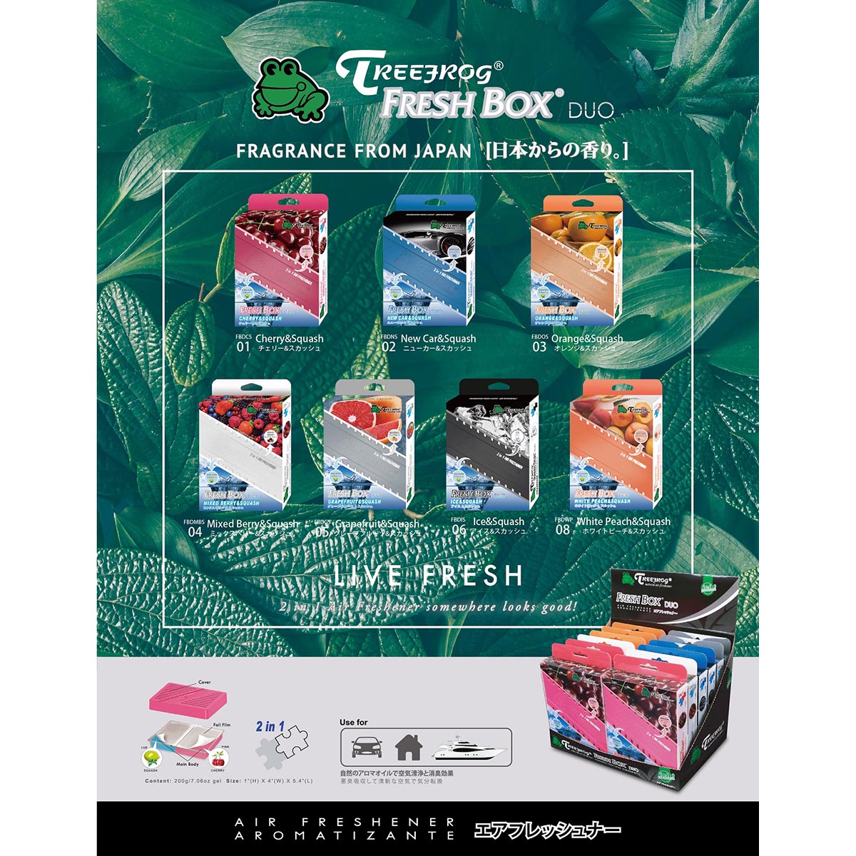 Treefrog Fresh Box Duo is a 2 in 1 Natural Air Fresheners is a premium car air freshener that is ideal for placement under the seat in your car. Freshens and deodorizes with natural fragrances.